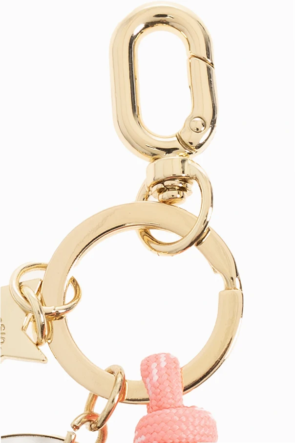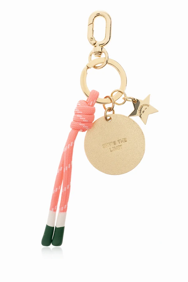 Delikatne dodatki z poliestru w barwie różowej, ozdobione jasnymi paskami i zakończone zielonymi końcówkami, nadają kompozycji wyjątkowości. Całość dopełnia złota gwiazda oraz masywny karabińczyk, zapewniający komfort użytkowania i bezpieczeństwo. Opisany brelok emanuje ponadczasową klasą, a każdy jego detal zachwyca precyzją wykonania.