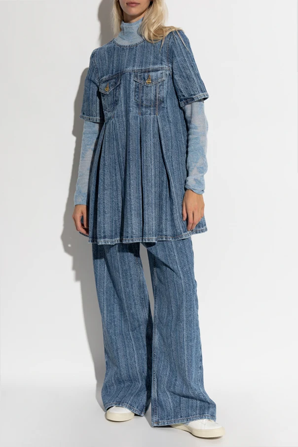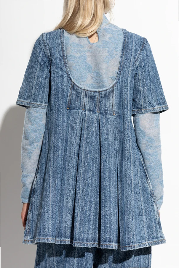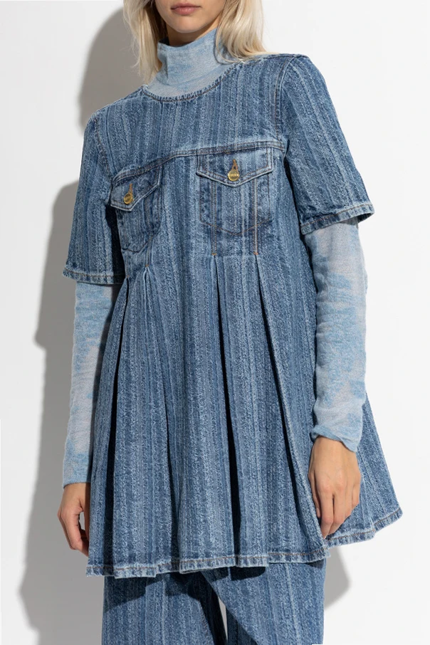 Jeansowa sukienka z zaszewkami sygnowana przez GANNI to esencja wyrafinowanej kobiecości oraz hołd dla ponadczasowej elegancji. Lekko rozkloszowany dół uzyskany dzięki szerokim zaszewkom harmonijnie podkreśla sylwetkę, zaś krótkie rękawy i subtelny dekolt z przodu dopełniają całości niebanalnego projektu. Głębsze wycięcie z tyłu wprowadza intrygującą lekkość, czyniąc sukienkę odpowiednią zarówno na co dzień, jak i na specjalne okazje.