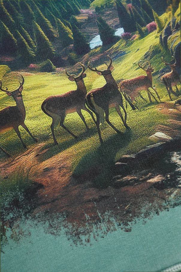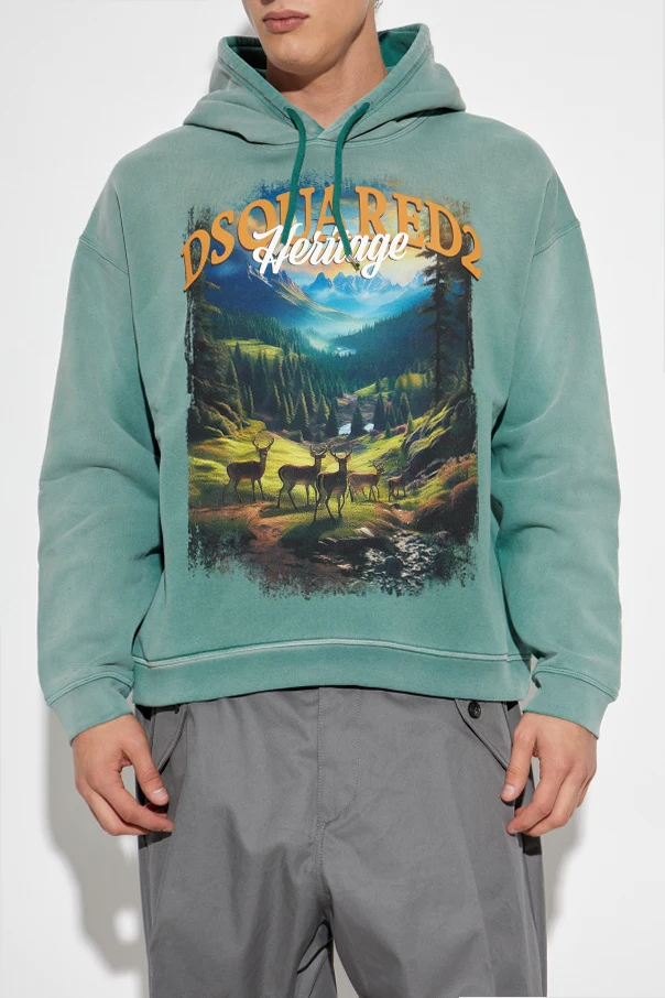Luźny krój oraz miękkie ściągacze zapewniają komfort i swobodę ruchów, a kaptur podkreśla praktyczny wymiar projektu. Centralną część bluzy zdobi spektakularny, szczegółowy nadruk – malownicza sceneria górska z jeleniem, otoczona artystycznie przyciemnionymi krawędziami. Wyraziste napisy „DSQUARED2” oraz „Heritage” odzwierciedlają dziedzictwo kanadyjskich designerów, mistrzowsko łączących kontrastowe inspiracje haute couture i mody codziennej.