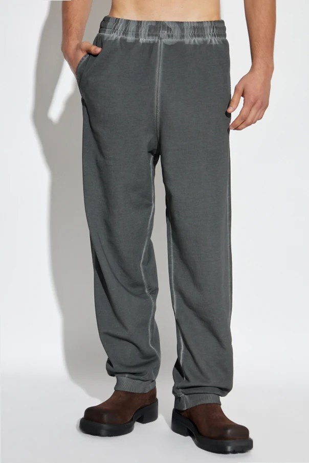 Spodnie dresowe P-MARKY-CUFF-T1 marki Diesel to kwintesencja stylu i wyrafinowania w codziennym wydaniu. Utrzymane w jednolitym, szarym odcieniu, prezentują się niezwykle elegancko dzięki klasycznemu fasonowi typu jogger z luźną, prostą nogawką zakończoną ściągaczem. Wykonane z wysokogatunkowej bawełny, wyróżniają się niezwykłą miękkością i komfortem noszenia.