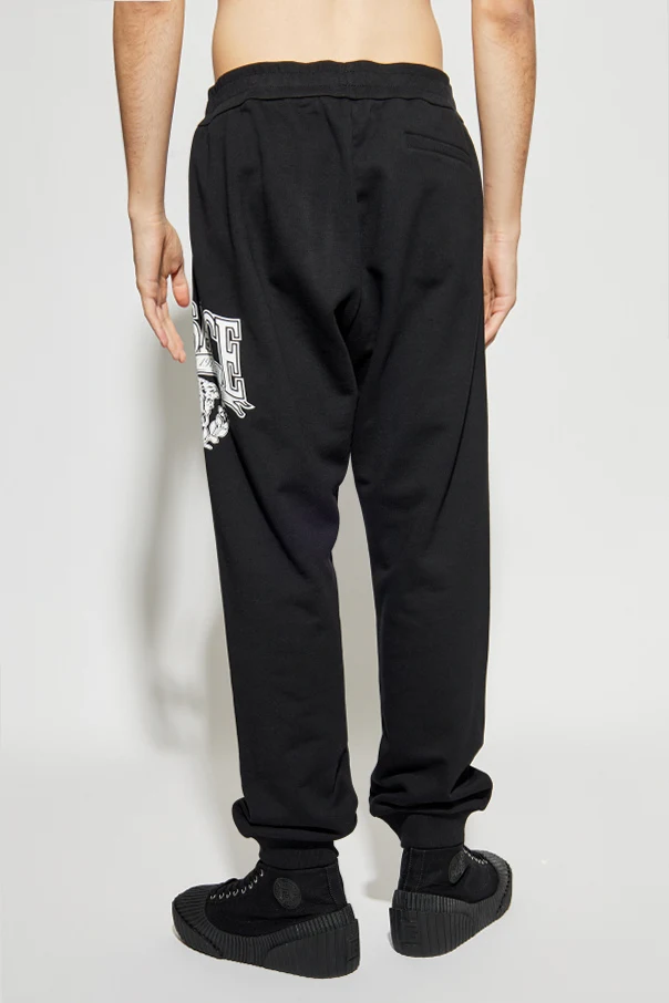 Czarne tło zostało efektownie przełamane wyrazistym, dużym białym logo projektanta wraz z motywem głowy Meduzy i napisem „Established 87”. Ten rozpoznawalny nadruk na lewej nogawce nadaje spodniom unikatowy charakter, będąc esencją stylu marki. Wysokogatunkowa bawełna gwarantuje niezwykły komfort noszenia i prestiżowy wygląd, a klasyczne boczne kieszenie oraz dyskretna kieszeń tylna podkreślają funkcjonalność tego modelu.