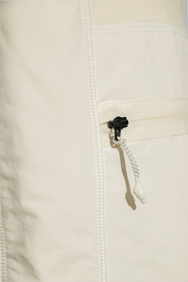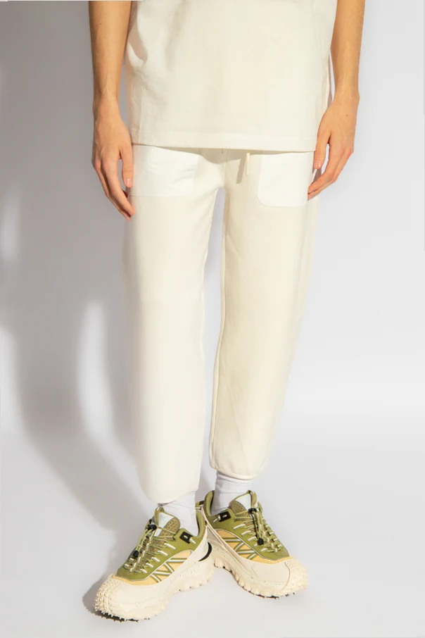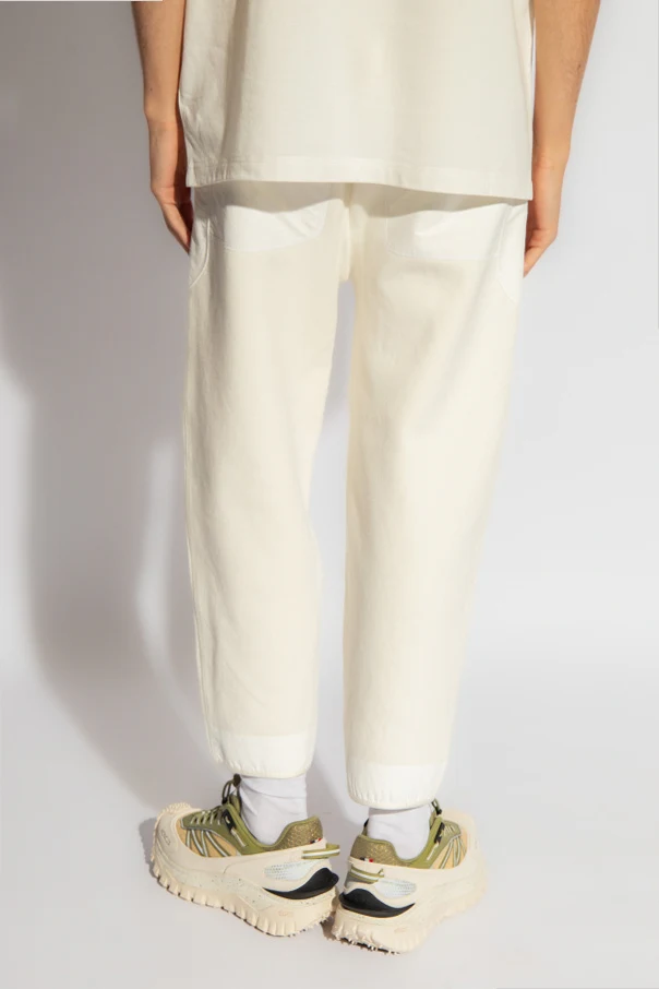 Biało-kremowe spodnie dresowe Moncler, kolekcja kapsułowa ‘Year of the Dragon’. Wykonane z łączonych materiałów. W pasie wszyta guma ściągana trokami. Cztery kieszenie: dwie wsuwane i dwie zapinane na zamek. Długie nogawki zakończone elastyczną lamówką.