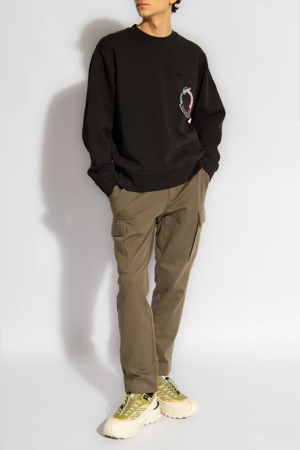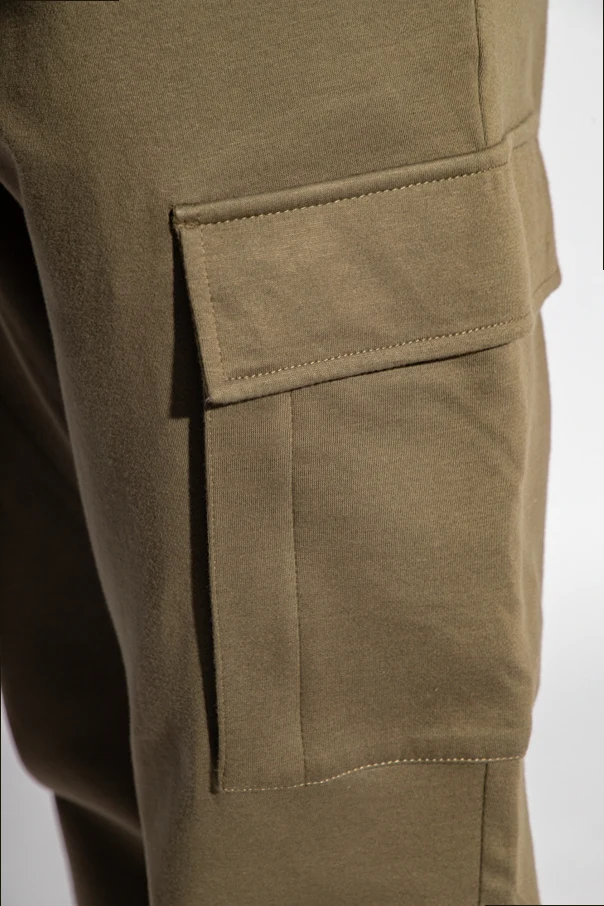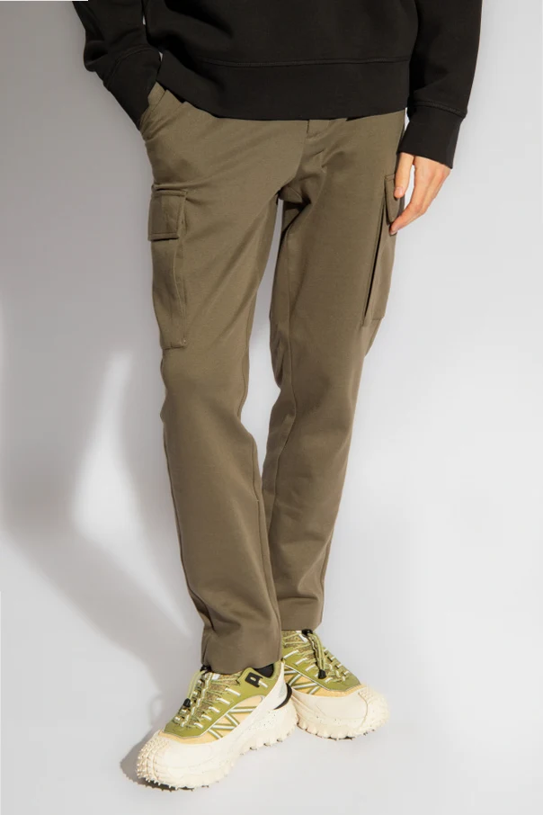 Spodnie typu ‘cargo’ w kolorze khaki Moncler. Wykonane z bawełny. Zapinane na zamek i guziki. Z tyłu naszywka w kształcie logo. Sześć kieszeni: cztery wsuwane i dwie z patką zapinaną na zatrzaski. Długie, lekko zwężane nogawki.