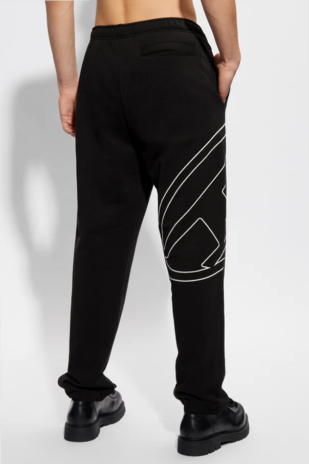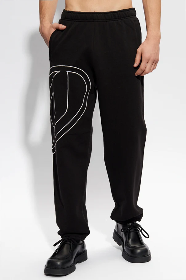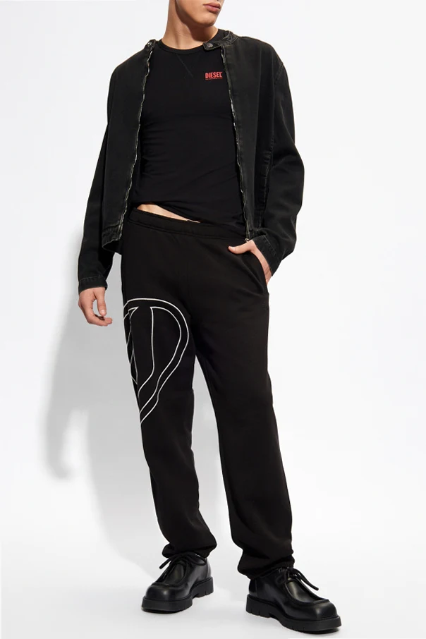 Czarne spodnie dresowe, model ‘P-MARKY-MEGOVAL-D’ Diesel. Wykonane z bawełny. W pasie wszyta guma ściągana trokami. Ozdobione białym, wyszytym logo. Trzy wsuwane kieszenie: dwie z przodu oraz z tyłu. Długie nogawki zakończone ściągaczem.