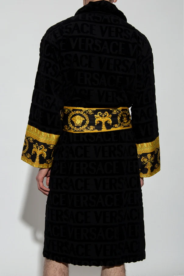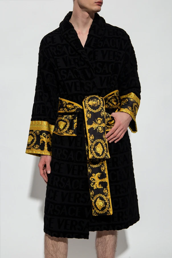 Czarny szlafrok Versace Home. Wykonany ze strukturalnej bawełny z logo. Wykończony wzorzystym materiałem z charakterystycznym dla marki motywem barokowym oraz głowami Meduzy. Wiązany w pasie. Dwie kieszenie wsuwane. Długie rękawy.