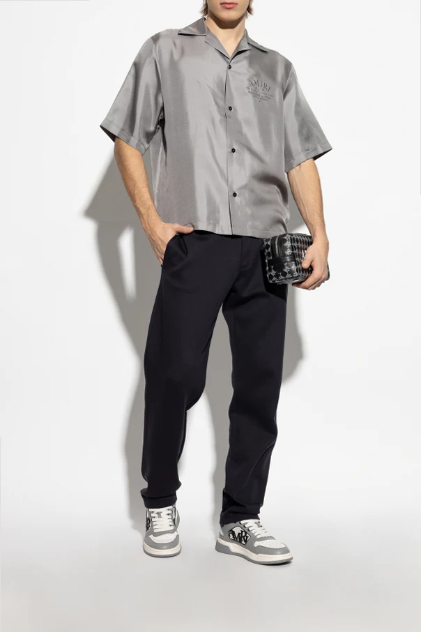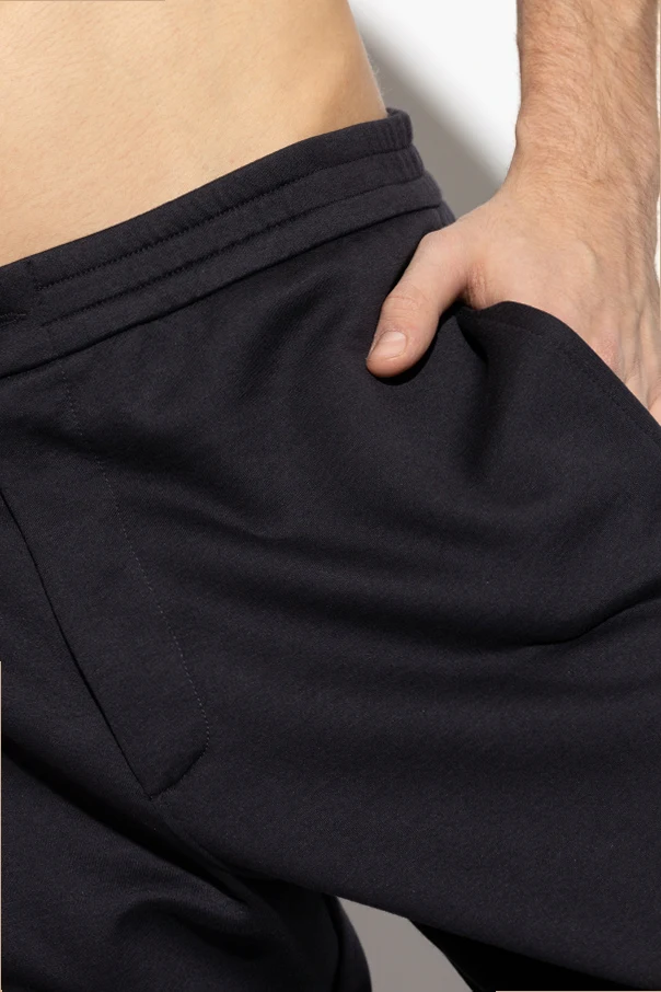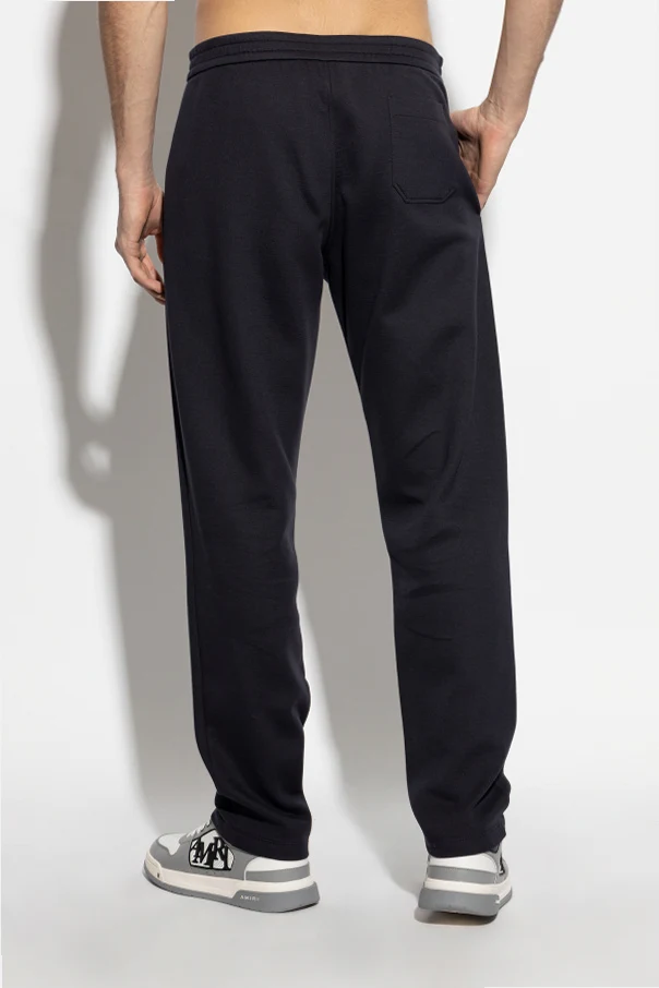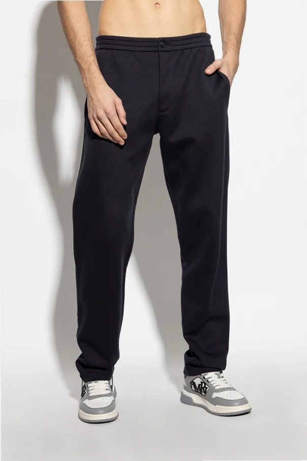 Czarne spodnie Giorgio Armani. Wykonane z bawełny. Zapinane na zamek oraz guzik. Trzy wsuwane kieszenie: dwie z przodu i pojedyncza kieszeń z tyłu. Zwężane nogawki.