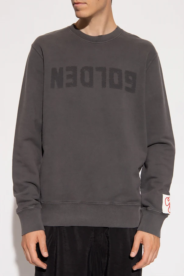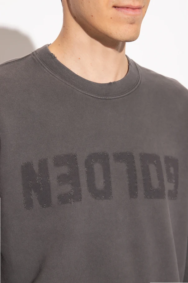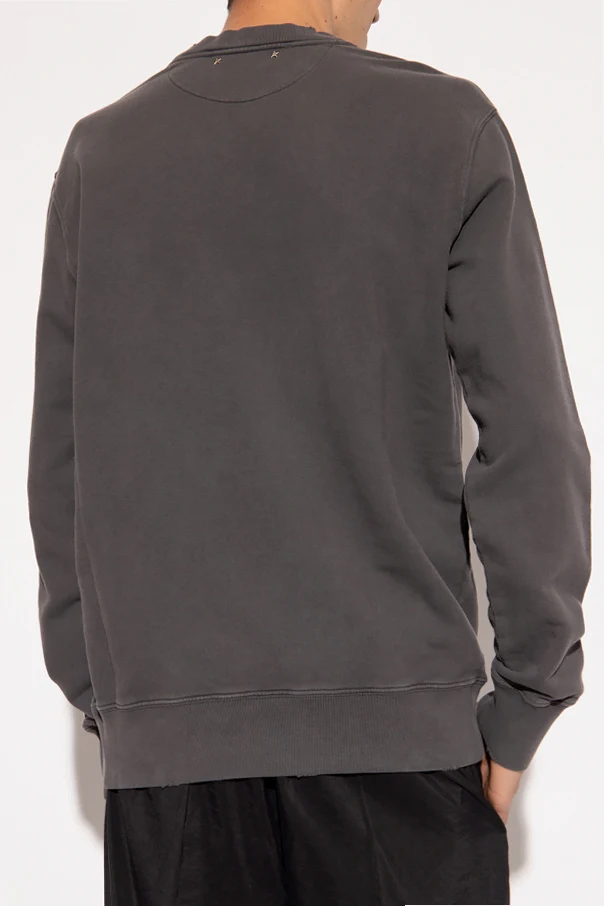 Ciemnoszara, bawełniana bluza z przetarciami Golden Goose. Z przodu ozdobiona nadrukowanym napisem ‘Golden’. Z tyłu dwie metalowe aplikacje w kształcie gwiazd w kolorze postarzanego srebra. Okrągły dekolt, długie rękawy oraz dół wykończone ściągaczem.
