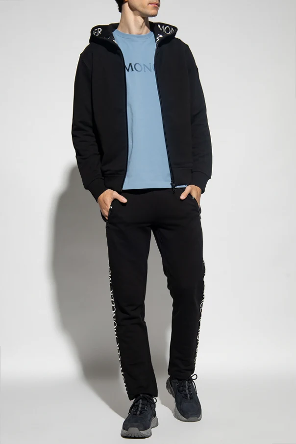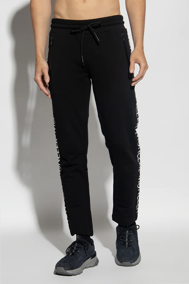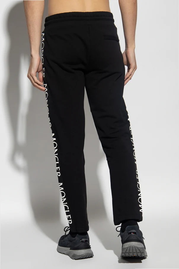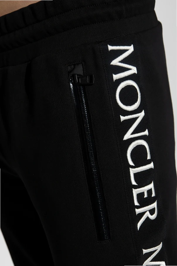 Czarne, bawełniane spodnie dresowe Moncler, kolekcja ‘Matt Black’. W pasie ściągane trokami. Ozdobione wyszytym białym logo. Trzy kieszenie zapinane na zamek: dwie z przodu i jedna z tyłu. Lekko zwężane nogawki.