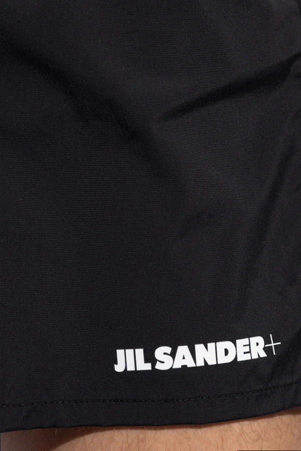 Czarne szorty kąpielowe JIL SANDER+. W pasie wszyta guma ściągana trokami. Ozdobione białym nadrukiem z logo. Trzy kieszenie: dwie wsuwane oraz zapinana na zamek.