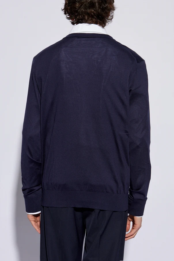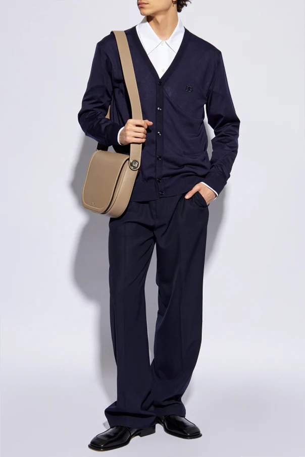 Kardigan zapinany jest na guziki, które harmonijnie komponują się z kolorem materiału, tworząc spójną i wyrafinowaną całość. Dodatkowo, po obu stronach przedniej części umieszczono dwie funkcjonalne kieszenie, co zwiększa praktyczność tego wyjątkowego elementu garderoby. Subtelne, jednak wyraźne logo projektanta Dolce & Gabbana , wyszywane z tej samej nitki, co reszta produktu, delikatnie umieszczone na lewej piersi, podkreśla ekskluzywny charakter i autentyczność kardiganu.
