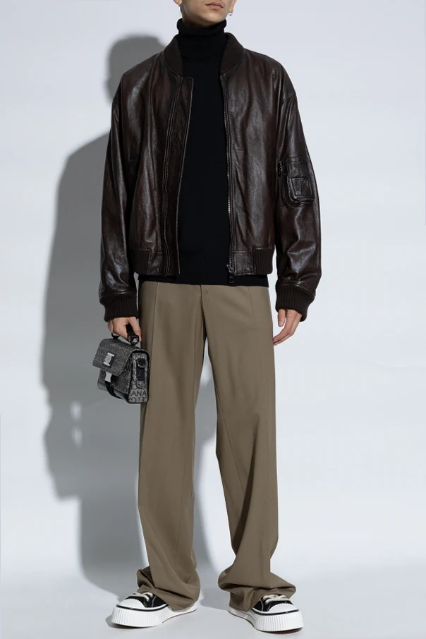 Na lewej piersi umieszczona jest mała, prostokątna naszywka z logo projektanta, wykonana w kolorze czarnym z metalowymi detalami. Naszywka przymocowana jest czterema metalowymi nitami, co dodaje solidności i luksusowego wyglądu.