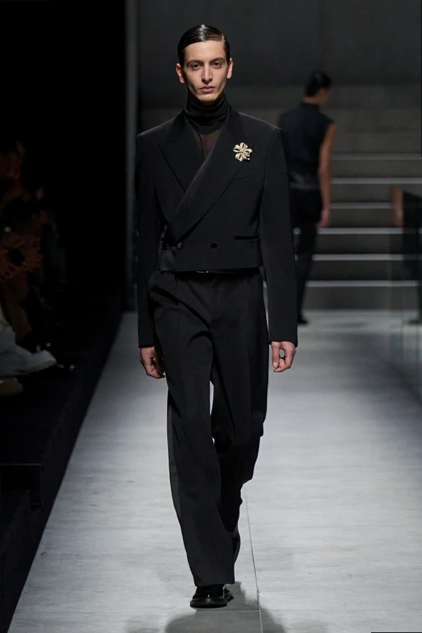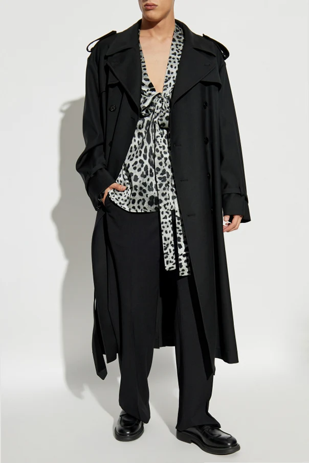 Na jednym ze zdjęć spodnie zestawione są z długim, czarnym płaszczem oraz wzorzystą koszulą, co ilustruje ich wszechstronność i możliwość komponowania z różnymi elementami garderoby.
