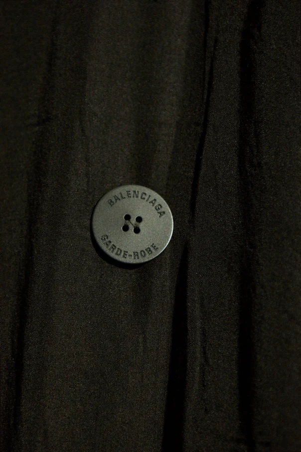 Szczegółowe wykończenia, takie jak podwójne zapięcie na guziki oraz klasyczne klapy i pagony na ramionach, podkreślają wysoką jakość wykonania. Guziki ozdobione logo "Balenciaga Garde-Robe" dodają prestiżu i elegancji.