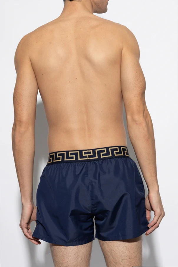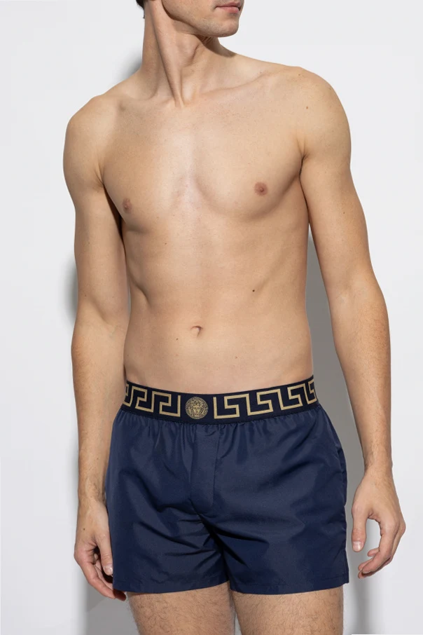 Prezentujemy męskie szorty kąpielowe od znanej i cenionej na całym świecie marki Versace . Te granatowe szorty emanują ekskluzywnością, łącząc w sobie klasyczny krój z nowoczesnym designem. Elastyczny pas, ozdobiony charakterystycznym greckim wzorem w kolorze złotym oraz centralnie umieszczonym logo z motywem Meduzy, nadaje im niepowtarzalnego stylu.