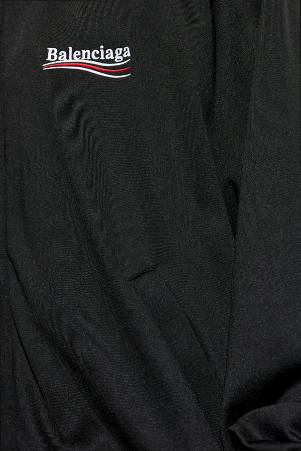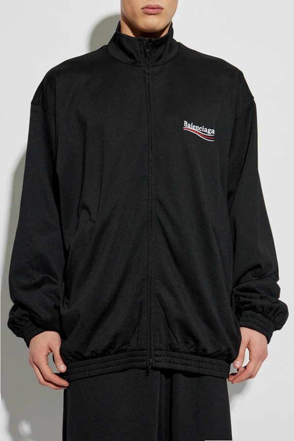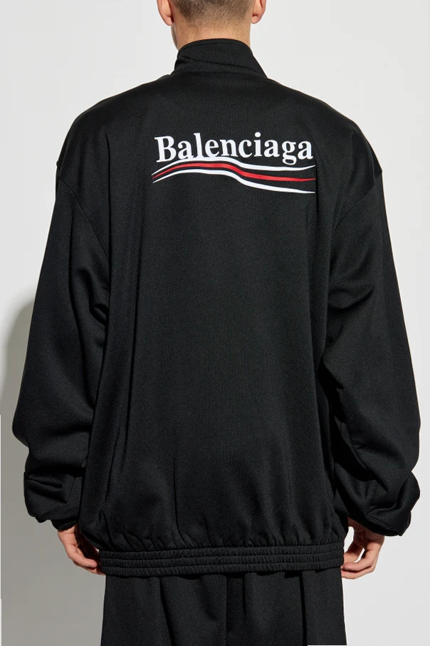 Bluza wykonana jest z doskonałej mieszanki materiałów, z przewagą poliamidu oraz bawełny, co zapewnia trwałość i komfort noszenia. Na lewej piersi i plecach znajduje się wyraźne logo marki „Balenciaga” w białym odcieniu, podkreślone czerwono-białą falą, co dodaje jej prestiżu. Kieszenie po bokach oraz elastyczne ściągacze na mankietach i dole są praktycznym dopełnieniem projektu.