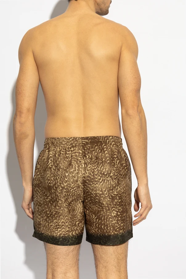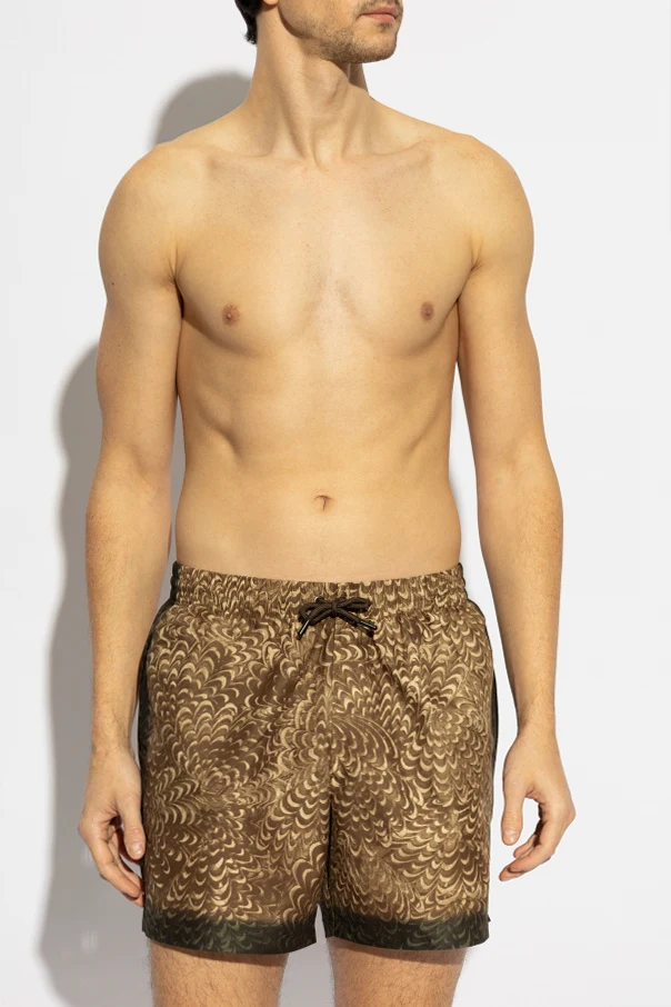 Przedstawiamy brązowe szorty kąpielowe z ekskluzywnej kolekcji Driesa Van Notena, wybitnego członka Szóstki z Antwerpii. Szorty te zachwycają unikalnym, falistym wzorem, który nadaje im elegancji i nowoczesnego charakteru. Wykonane z delikatnego i przewiewnego poliamidu, stanowią idealny wybór na słoneczne plaże.