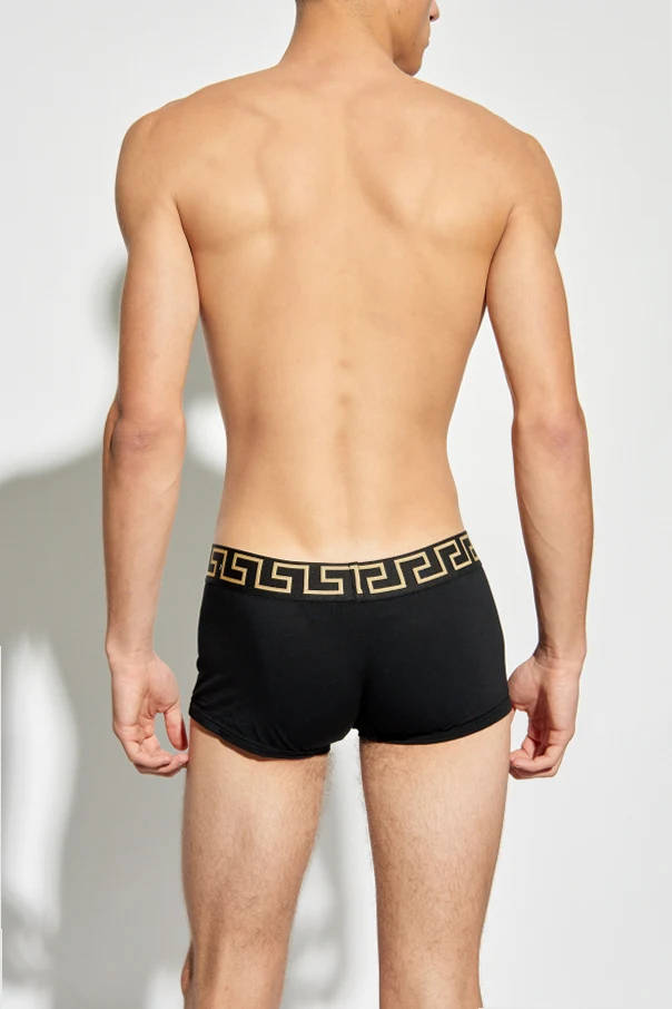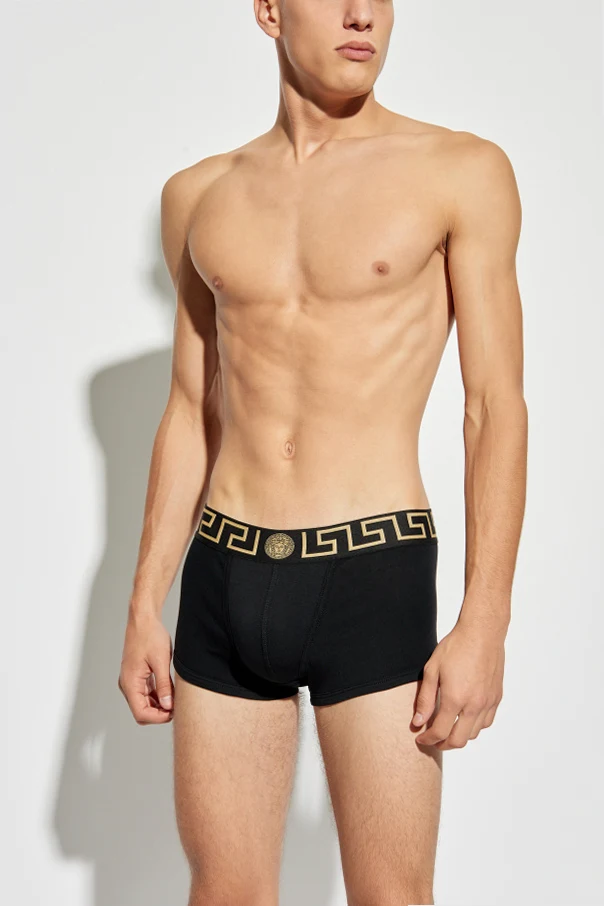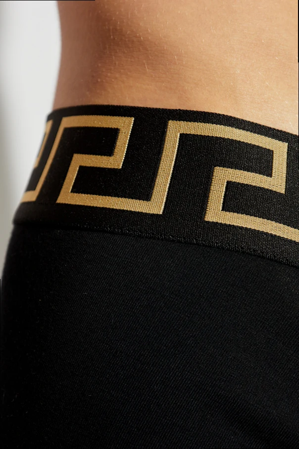 Każdy zestaw zawiera trzy pary bokserek w klasycznych kolorach: czarnym, białym i szarym. Każda para wyróżnia się szerokim paskiem w talii, ozdobionym złotym greckim wzorem oraz centralnie umieszczonym złotym logo Versace. To detale, które nadają bieliźnie wyjątkowego charakteru i podkreślają jej luksusowy status.