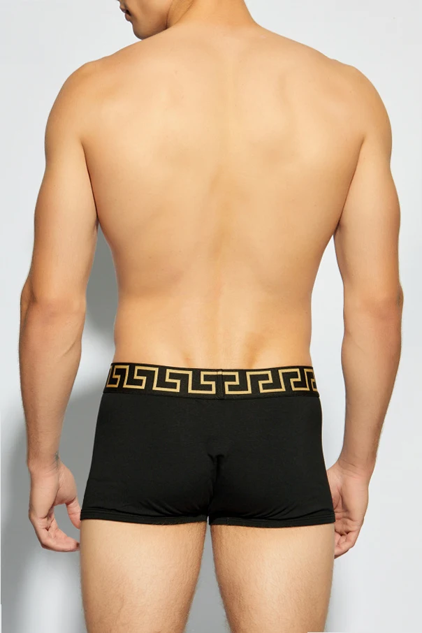 Wykonane z precyzją, z najlepszej jakości mieszanki bawełny i elastanu, zapewniają doskonałe dopasowanie i elastyczność, pozwalając na swobodę ruchów bez uczucia ograniczenia. Dominujący, głęboki czarny kolor , w połączeniu z szerokim paskiem ozdobionym charakterystycznym, złotym wzorem meandrowym oraz subtelnym logo projektanta , nadaje im wyrafinowany i luksusowy charakter.