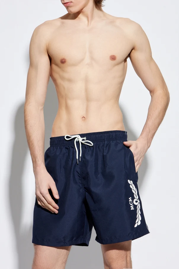 Klasyczny krój z elastycznym pasem i białym sznurkiem do regulacji gwarantuje idealne dopasowanie. Szorty wyróżniają się subtelnym, białym nadrukiem z logo "MCM" i eleganckim graficznym motywem przypominającym liście lub wieniec, co podkreśla ich nowoczesny wygląd.