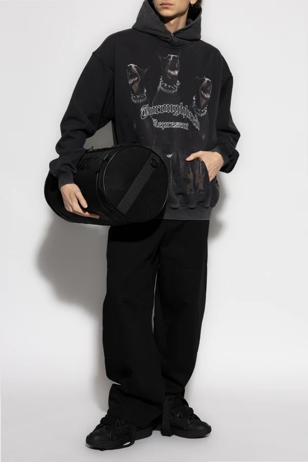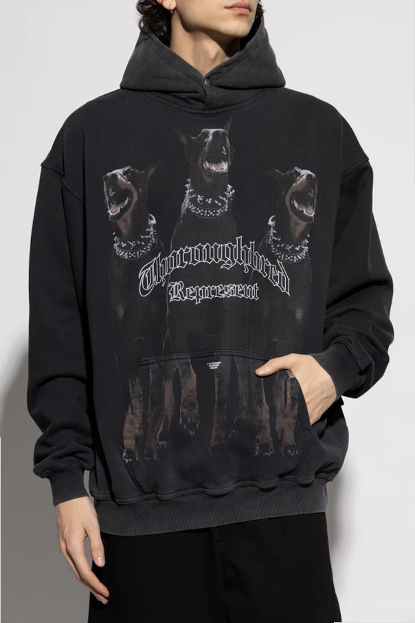 Przedstawiamy bluzę z kapturem "Thoroughbred" z prestiżowej kolekcji mody męskiej od uznanego projektanta Represent . Ta intrygująca propozycja łączy w sobie nowoczesny styl z wyrazistą grafiką, przedstawiającą trzy psy w łańcuchach, z napisem "Thoroughbred" powyżej oraz "Represent" poniżej.