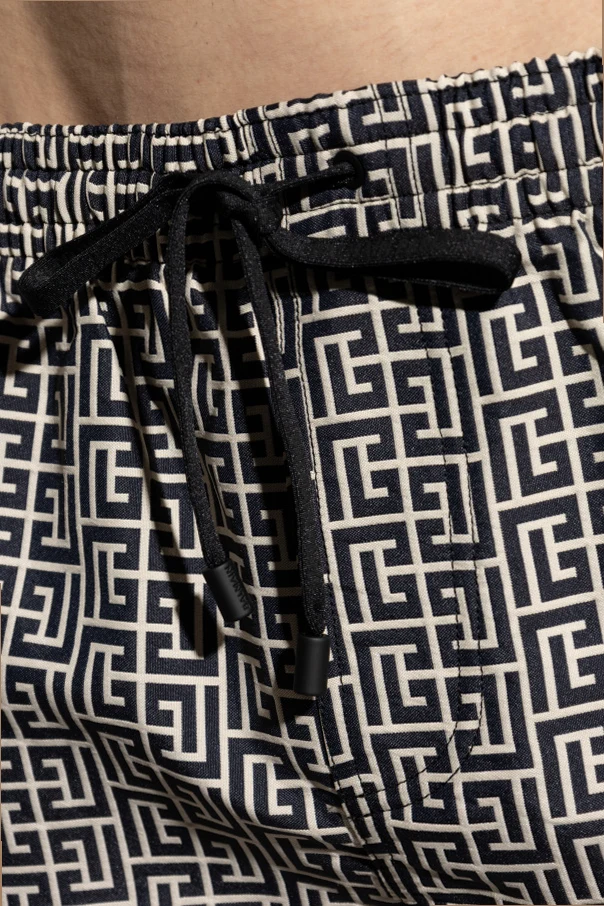 Przedstawiamy męskie szorty kąpielowe z ekskluzywnej kolekcji Balmain , które harmonijnie łączą nowoczesny design z funkcjonalnością. Geometryczny wzór, złożony z symetrycznych linii, w połączeniu z dominującą czernią i białymi akcentami, tworzy niepowtarzalny, wyrafinowany styl.