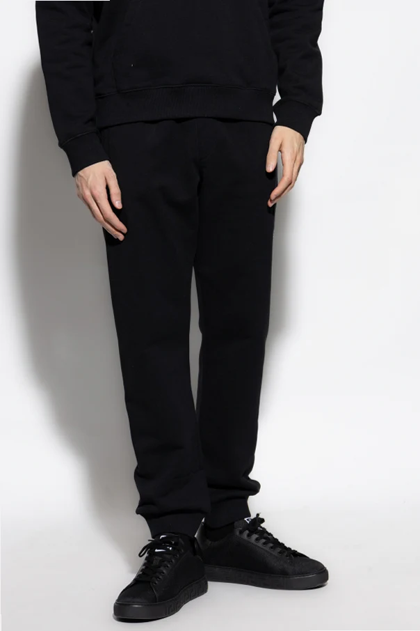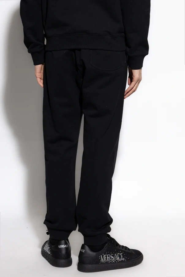 Odkryj luksusowy komfort, który oferują czarne spodnie dresowe z logo marki Versace. Wykonane z najwyższej jakości bawełny, odznaczają się miękkością i wygodą, idealną na każdą okazję. Klasyczny, prosty krój z elastycznym pasem, mankietami na nogawkach i ściąganymi trokami zapewnia doskonałe dopasowanie.