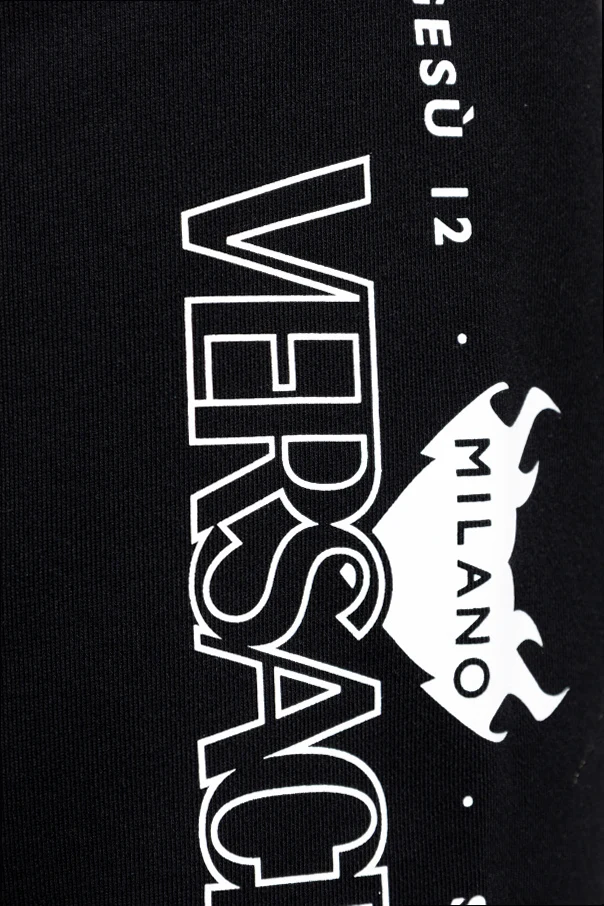 Charakterystyczne, białe logo "VERSACE" oraz napis "MILANO" zdobią lewą nogawkę, podkreślając ekskluzywność i rozpoznawalność produktu. Dodatkowo, praktyczne kieszenie boczne zwiększają ich funkcjonalność.