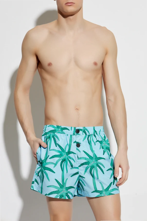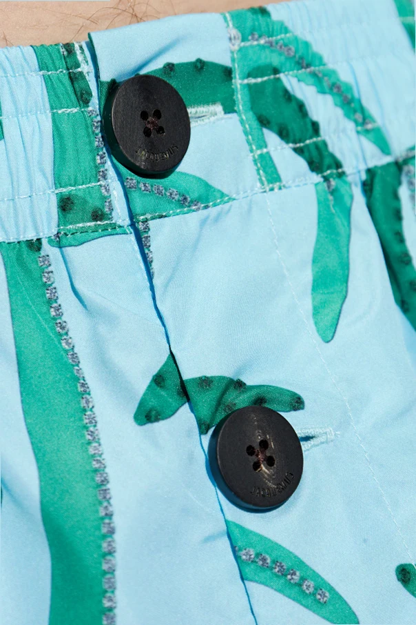 Przedstawiamy szorty kąpielowe z ekskluzywnej kolekcji Jacquemus , które oczarowują swoją subtelną elegancją i wyrafinowanym stylem. Wykonane z lekkiego, szybkoschnącego poliestru, prezentują dominujący niebieski kolor z nadrukiem zielonych palm, nadając tropikalny i wakacyjny wygląd.