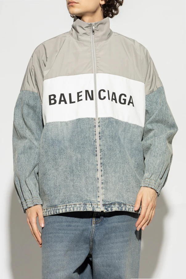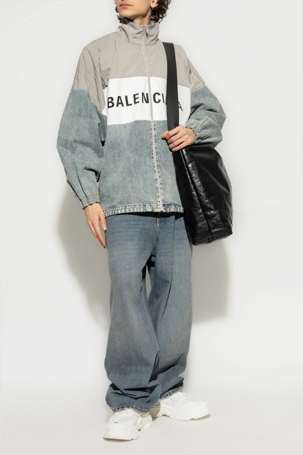 Oto kurtka typu bomber marki Balenciaga , niekwestionowane dzieło sztuki projektanta. Wyróżnia się dominującym szarym kolorem z jasnoszarymi i jeansowymi odcieniami, co tworzy intrygujący i nowoczesny wygląd . Na przodzie dumnie prezentuje się duże, kontrastowe logo "BALENCIAGA" na białym tle, które jest esencją ekskluzywnego designu.