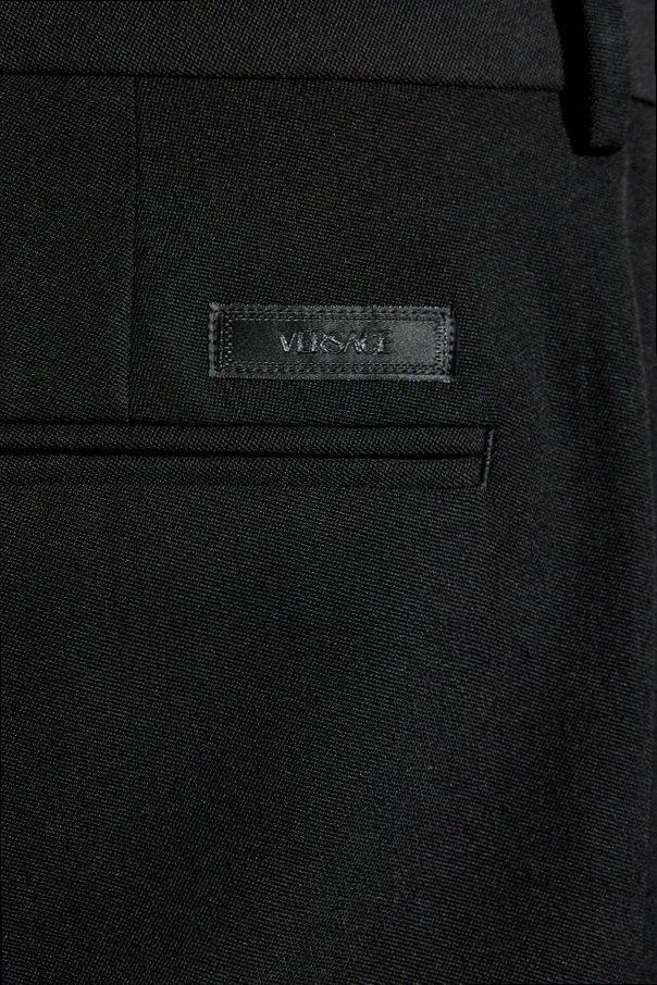 Minimalistyczny design spodnie są pozbawione wzorów, co pozwala na ich dopasowanie do szerokiej gamy stylizacji, pozostając w pełni formalnymi. Delikatne oznaczenie marki Versace świadczy o ich ekskluzywnym pochodzeniu, dodając prestiżu każdemu, kto je nosi.
