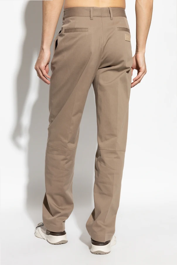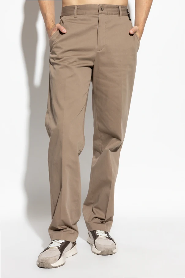 Spodnie w kant marki Fendi to kwintesencja wyrafinowanego stylu i ponadczasowego szyku. Gładka, beżowa tkanina o subtelnym splocie, kunsztownie wyselekcjonowana przez włoskich mistrzów, zapewnia wyjątkowy komfort noszenia i doskonałe dopasowanie do sylwetki dzięki domieszce elastanu. Klasyczny, prosty fason z delikatnie zwężanymi nogawkami podkreśla elegancję, a precyzyjne przeszycia i starannie zaprasowany kant świadczą o najwyższej jakości wykonania.