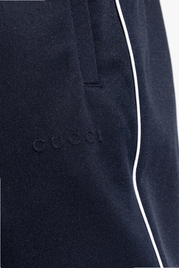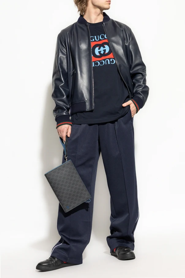 Całość utrzymana w głębokim odcieniu granatu, została ozdobiona tonalnym, wypukłym logo GUCCI oraz subtelnymi, białymi lamówkami wzdłuż szwów, co delikatnie akcentuje wyrafinowany styl i sportową elegancję.