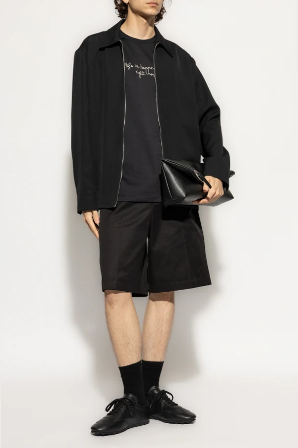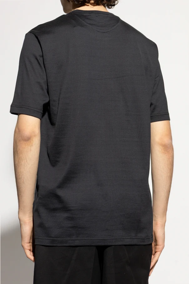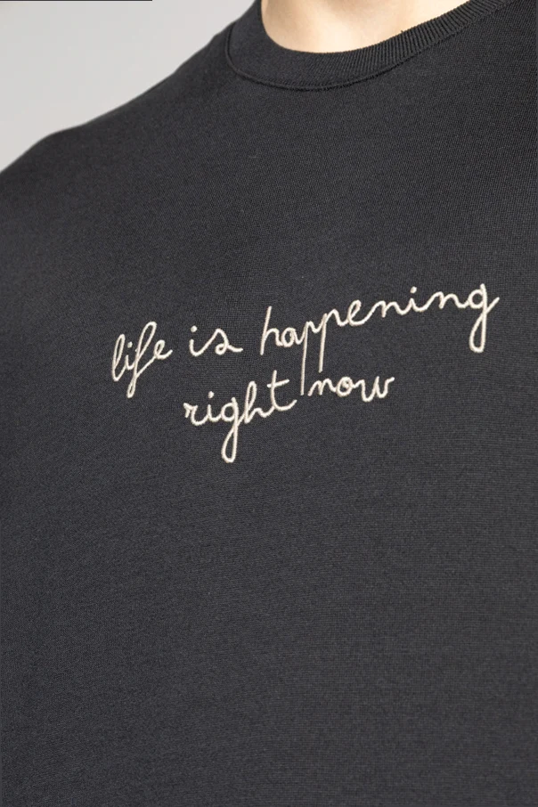 T-shirt z wyszyciem marki Eleventy to kwintesencja subtelnego luksusu, wyrażona w formie klasycznego fasonu regular fit. Utrzymana w głębokiej czerni koszulka zachwyca gładkością wysokogatunkowej bawełny, która oferuje niezwykłą miękkość oraz komfort noszenia. Minimalistyczny charakter podkreśla kontrastowe, białe wyszycie – odręczny napis „life is happening right now” , dyskretnie umieszczony na wysokości klatki piersiowej.