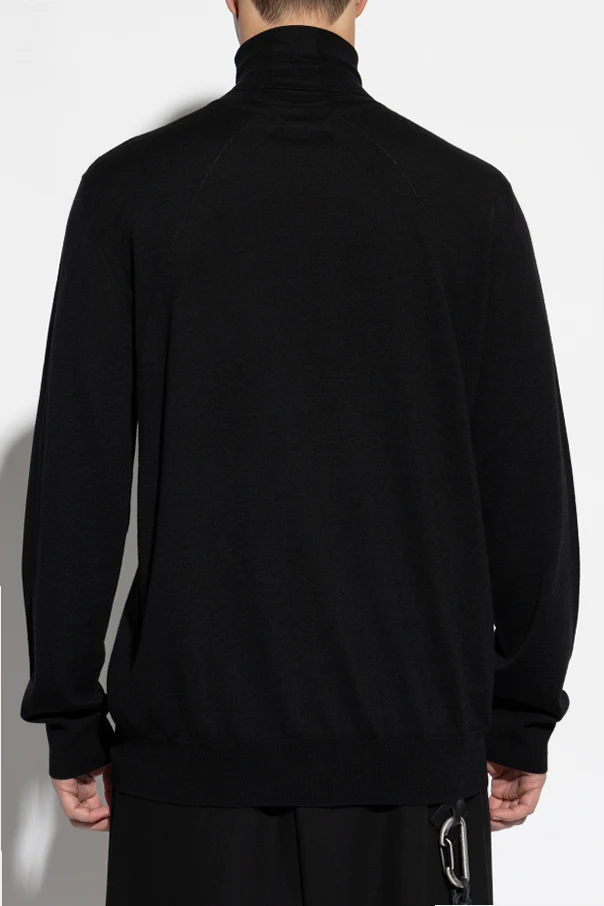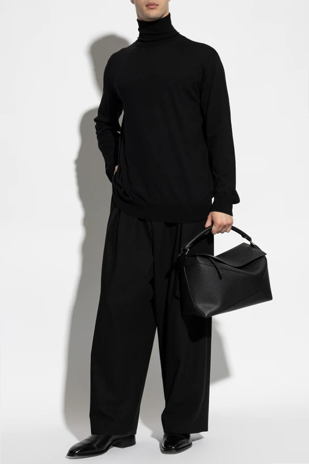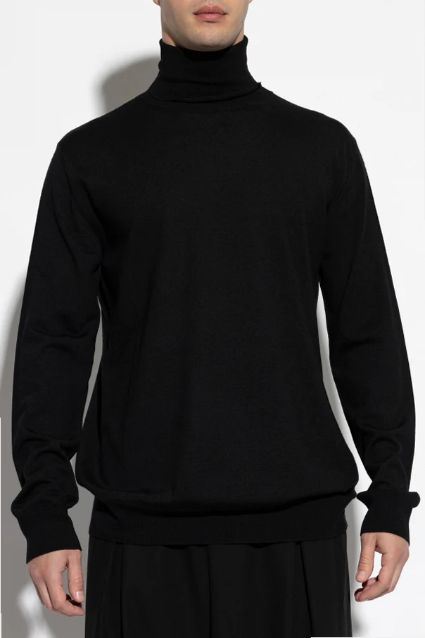 Wełniany golf JIL SANDER to uosobienie wysublimowanej prostoty oraz kunsztu rzemiosła, który niezmiennie cechuje tę znakomitą niemiecką markę. Wykonany z wysokogatunkowej, miękkiej wełny, prezentuje klasyczny krój z długimi rękawami oraz przylegającym, eleganckim kołnierzem. Gładka, czarna tkanina i minimalistyczna forma pozbawiona ozdób czynią z tego swetra doskonałą propozycję dla miłośników ponadczasowego stylu.