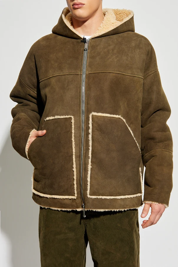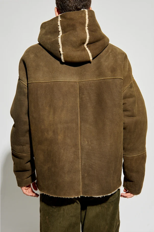 Model wykonany jest w całości z naturalnej, jagnięcej skóry o matowym, zamszowym wykończeniu. Wzrok przyciągają kontrastowe obszycia z jasnego, aksamitnie miękkiego futerka, delikatnie zaakcentowane na krawędziach, przy kieszeniach oraz wewnątrz kaptura. Subtelny oliwkowo-zielony kolor, minimalistyczny design oraz dekoracyjne przeszycia potęgują wrażenie luksusu.