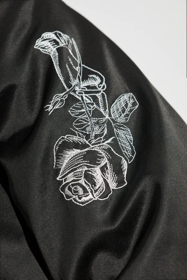 Zewnętrzna, satynowa tkanina o delikatnym połysku podkreśla ekskluzywny charakter, a starannie dobrana mieszanka bawełny i wiskozy gwarantuje komfort użytkowania. Minimalistyczny przód zdobi subtelne logo, podczas gdy plecy olśniewają wyrazistym haftem przedstawiającym żaglowiec otoczony motywami morskimi i florystycznymi.