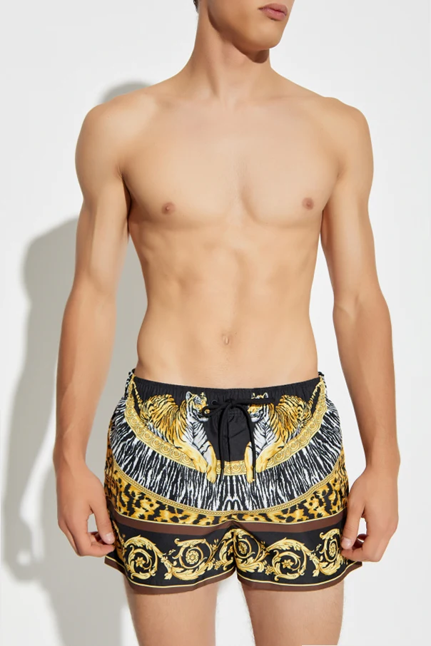 Szorty kąpielowe z nadrukiem marki Versace to kwintesencja wyrafinowania i ekstrawagancji. Klasyczny, regularny krój o długości do górnej części uda zapewnia swobodę i wygodę noszenia. Niezwykle bogaty, barokowy nadruk, zdobiony motywami zwierzęcymi i dwoma majestatycznymi tygrysami, otoczonymi złotymi ornamentami, wspaniale podkreśla ekskluzywny charakter produktu.