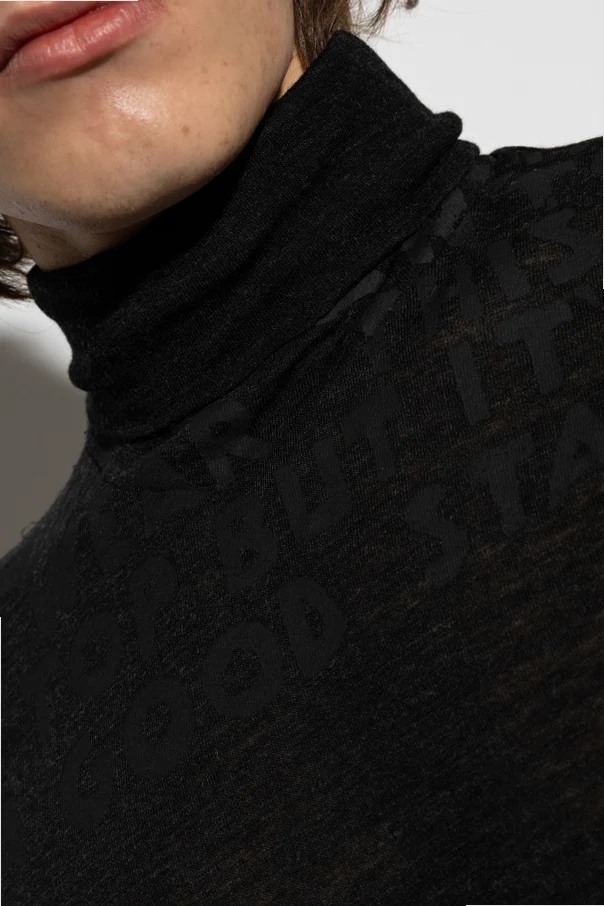 Gładka, czarna powierzchnia tego wyrobu stanowi doskonałe tło dla delikatnego, designerskiego napisu „ WEAR THIS TOP BUT IT'S A GOOD START ” wtopionego w materiał na wysokości klatki piersiowej i golfu. Matowość napisu subtelnie kontrastuje z połyskiem przędzy, podkreślając awangardowy charakter projektu. Minimalistyczny fason o wyrafinowanej linii wpisuje się w ponadczasowe trendy konceptualnej mody.