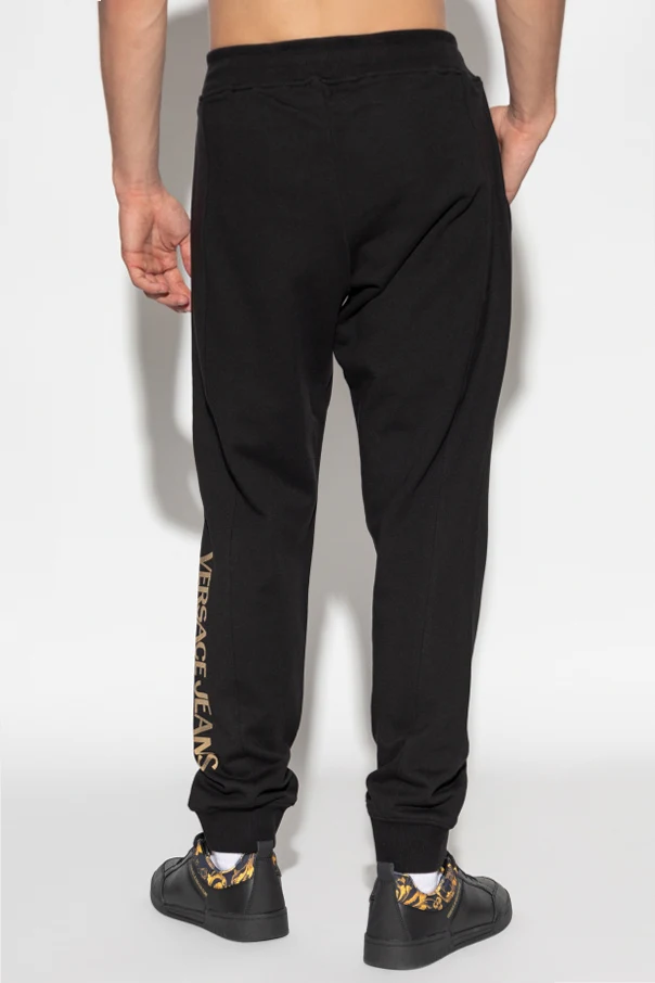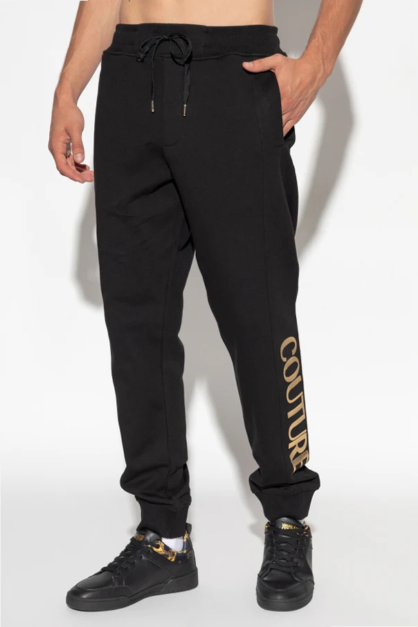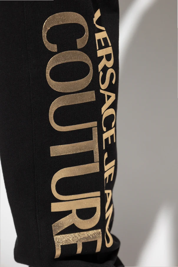 Spodnie dresowe z nadrukowanym logo marki Versace Jeans Couture to uosobienie wyrafinowanej wygody, gdzie ponadczasowy czarny kolor spotyka się z prestiżem włoskiego domu mody. Uszyte z wyjątkowo miękkiej, starannie wyselekcjonowanej bawełny, zachwycają gładką, matową fakturą , która subtelnie podkreśla wykwintny charakter produktu.