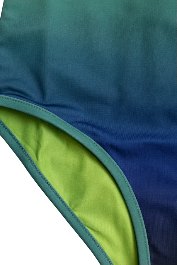 Zachwyca efektownym gradientowym wzorem – płynnym przejściem barw od jasnozielonego, przez głęboką zieleń po ciemnoniebieski, z limonkowym wykończeniem podszycia. Całość dopełnia wyraźne, haftowane logo w formie czerwonego rombu z motywem graficznym – dyskretny znak prestiżu.