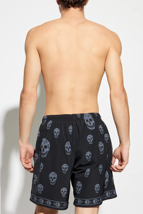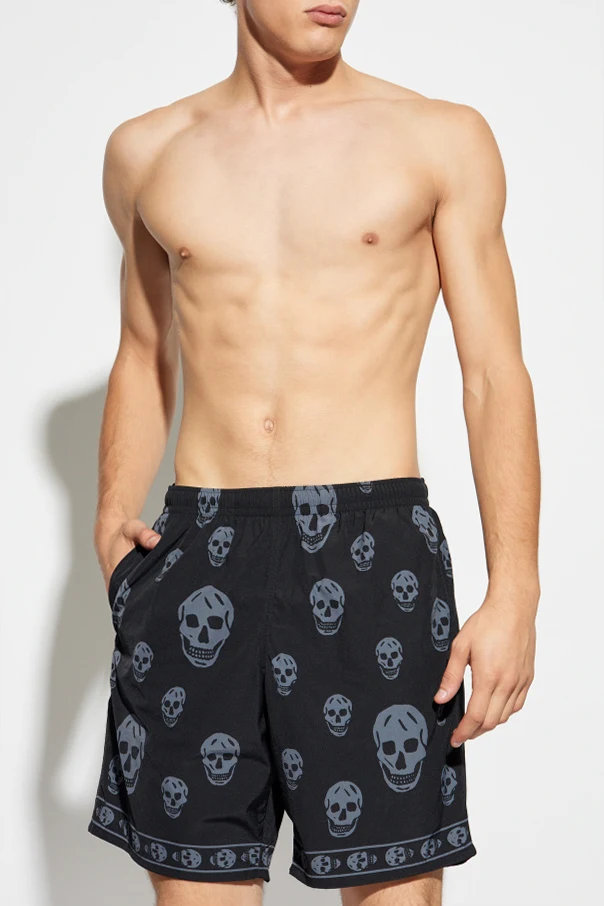 Szorty kąpielowe zaprojektowane przez Alexandra McQueena to kwintesencja nowoczesnej elegancji o niepowtarzalnym wyrazie. Klasyczny, swobodny fason z elastyczną talią i ściągaczem gwarantuje zarówno komfort, jak i wielkomiejski styl. Na całej powierzchni dominuje wyrazisty motyw jasnoszarych czaszek, będący znakiem rozpoznawczym tej uznanej brytyjskiej marki, podkreślającym jej śmiałość i artystyczną niezależność.
