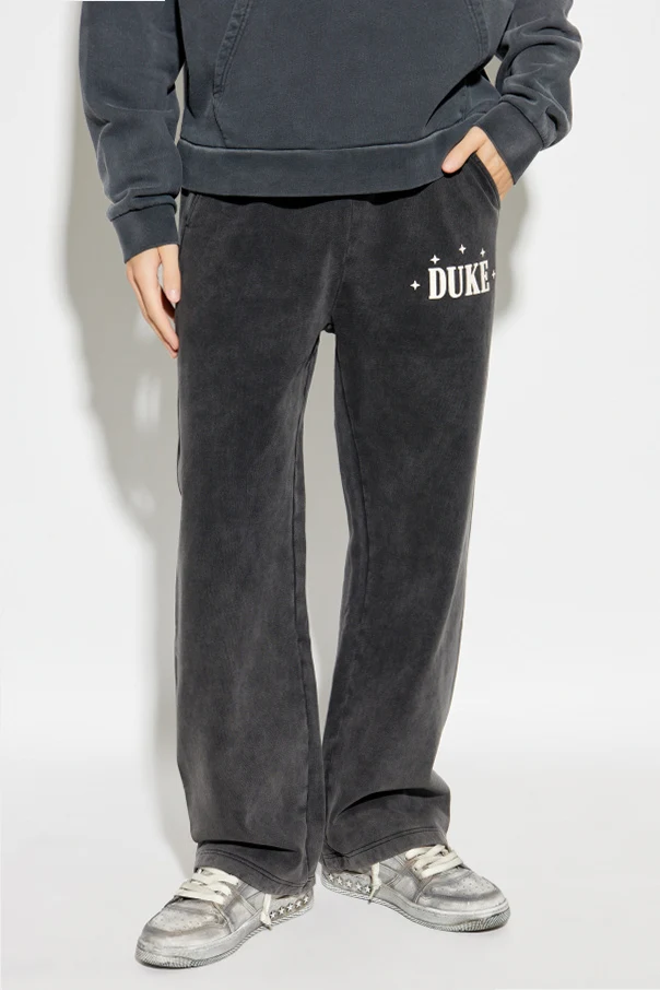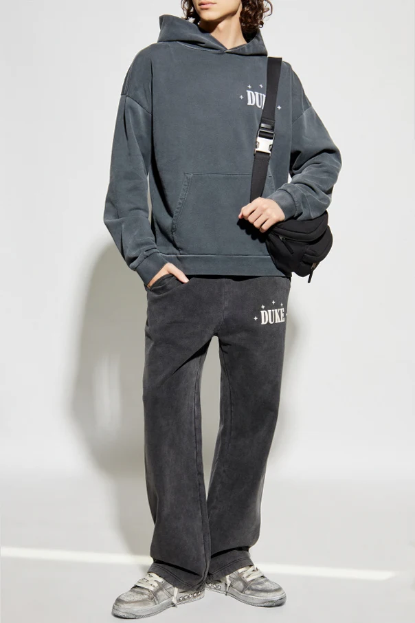 Spodnie dresowe z logo marki DUKE & DEXTER to wyrafinowana propozycja dla mężczyzn ceniących śmiałą elegancję w wydaniu codziennym. Czerń tkaniny, o wyjątkowo głębokim odcieniu oraz subtelnym efekcie sprania, wzbogacona została precyzyjnym detalem–białym emblematem “DUKE” oraz czterema gwiazdkami, umieszczonymi dyskretnie na lewym udzie.