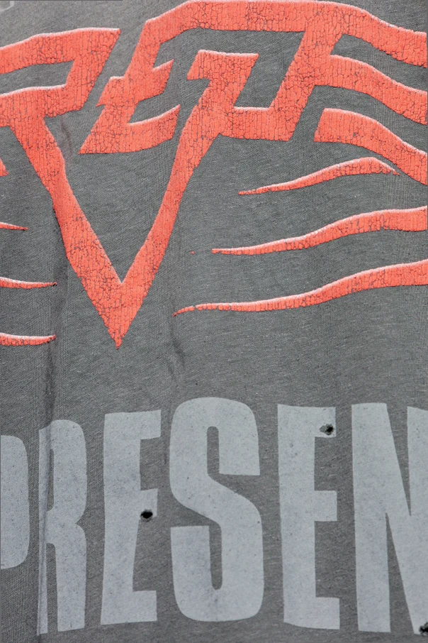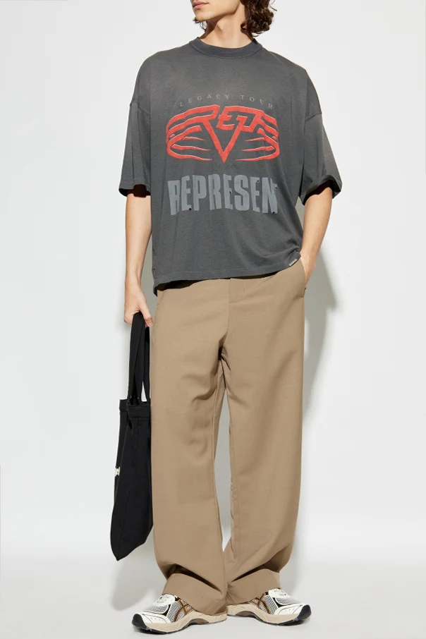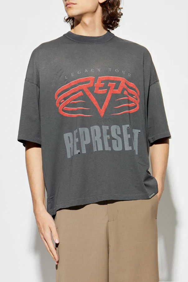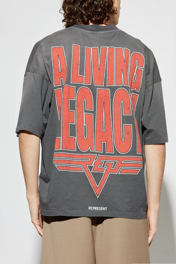 Dominujące, ekspresyjne nadruki – wielki napis „REPRESENT”, artystyczny czerwony emblemat oraz tylny napis „A LIVING LEGACY” – subtelnie przeplatają się z finezyjnymi przetarciami i stylizowanymi mikro-dziurkami. Detale te ukazują unikatowość produktu, podkreślając jego nowoczesny duch oraz kunszt projektanta marki Represent .