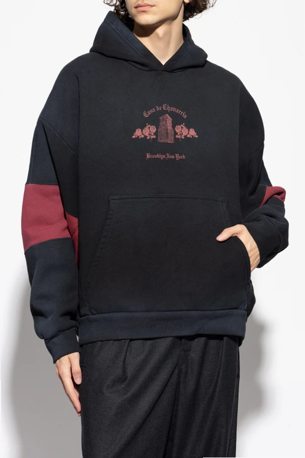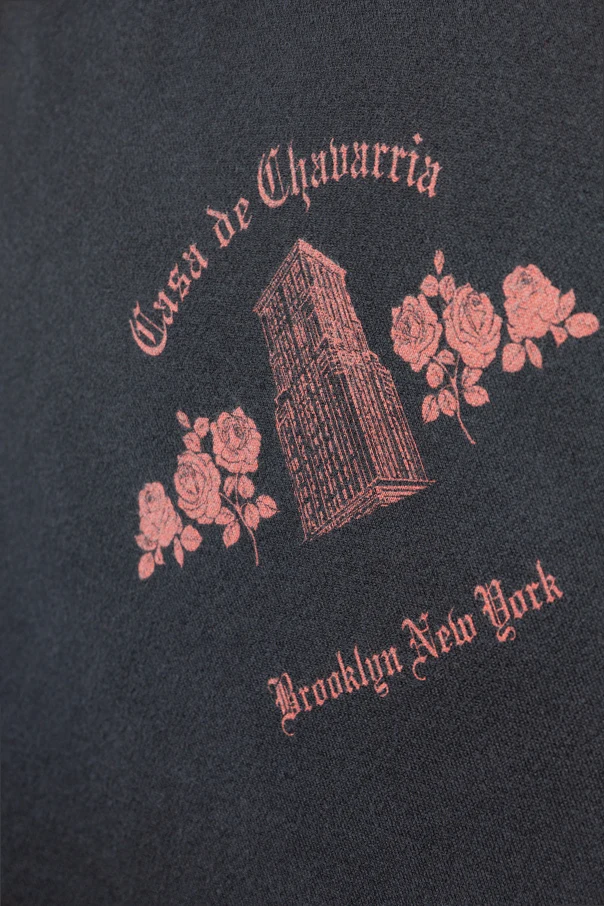 Czarny ton podkreśla ponadczasową elegancję, podczas gdy wyrazisty nadruk w odcieniu brudnego różu i czerwieni – z motywem budynku otoczonego różami oraz napisem “Casa de Chavarria” – dowodzi unikatowego kunsztu artystycznego. Pojedyncza kieszeń typu kangurka oraz obszerne rękawy dopełniają całości, tworząc harmonijną kompozycję nowoczesności i wygody.