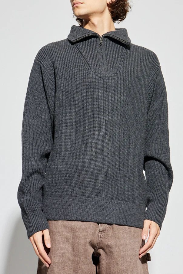 Wełniany sweter marki Officine Générale emanuje subtelną elegancją oraz ponadczasowym stylem. Wykonany z wyselekcjonowanej, gęstej wełny o grubszym, jednolicie prążkowanym splocie, urzeka niezwykłą miękkością i trwałością. Klasyczny, lekko luźny fason z długimi rękawami, ściągaczami oraz minimalistyczną linią zapewnia niepowtarzalny komfort noszenia i swobodę ruchów.