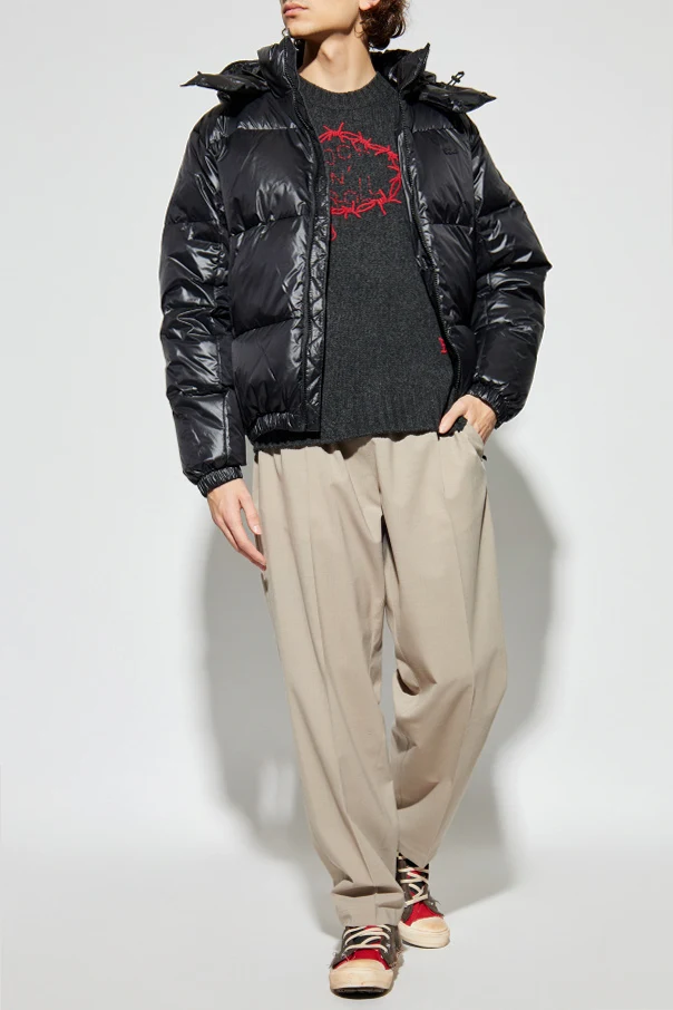 Niezwykłość tego produktu podkreślają wyraziste, czerwone hafty – szczególnie oryginalna, asymetrycznie rozmieszczona aplikacja z motywem korony z drutu kolczastego, wzbogacona napisem „ROCK ‘N’ ROLL”. Przy mankietach, na dolnym brzegu i kołnierzu widoczna jest subtelna, prążkowana struktura podkreślająca solidność materiału. Dodatkowe hafty w formie graficznych napisów, takich jak „EARTH 79”, budują niepowtarzalny, artystyczny wyraz całości.