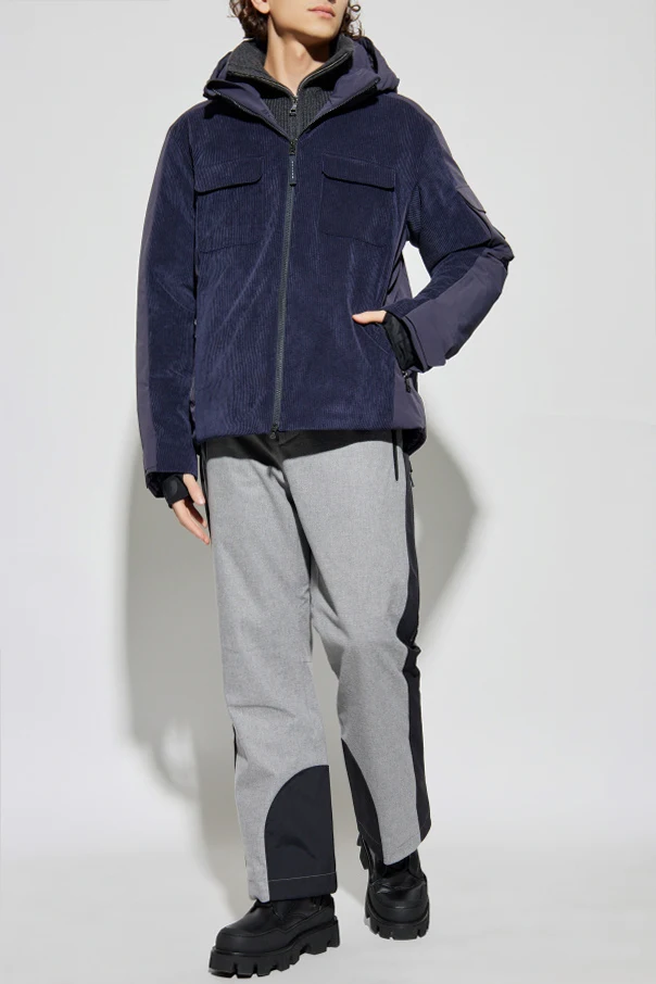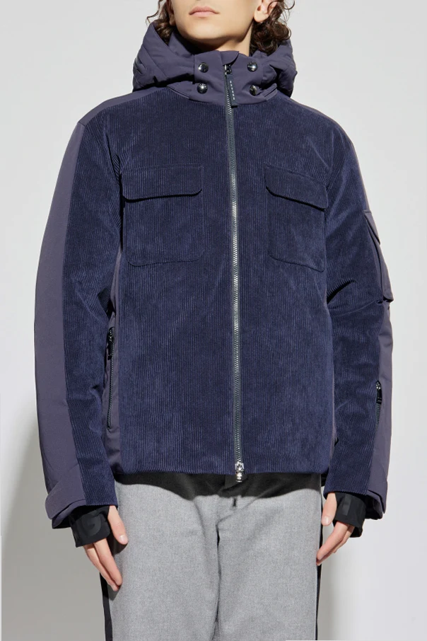 Przód kurtki został wykonany z wyrazistego sztruksu o głębokiej, pionowej strukturze, podczas gdy boki, rękawy i część tylna uszyto z technicznego materiału odpornego na niekorzystne warunki atmosferyczne. Pikowana konstrukcja i wykorzystanie szlachetnego puchu gwarantują komfort termiczny podczas zimowych aktywności. Centralny, dwustronny suwak oraz subtelne, dyskretne oznaczenie projektanta na kieszeni rękawa dopełniają całości tego wyjątkowego projektu.