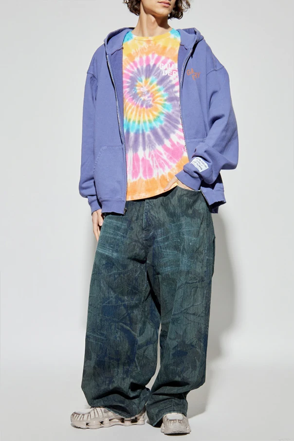 T-shirt z efektem „tie-dye” marki GALLERY DEPT. to esencja artystycznego wyrazu i miejskiej nonszalancji. Klasyczna, lekko oversize’owa forma, krótki rękaw oraz uniwersalny dekolt typu crew neck zapewniają ponadczasowy komfort i swobodę. Wzór w postaci spiralnych, koncentrycznych pasów przyciąga wzrok i podkreśla twórczą ekspresję kalifornijskiego projektanta.