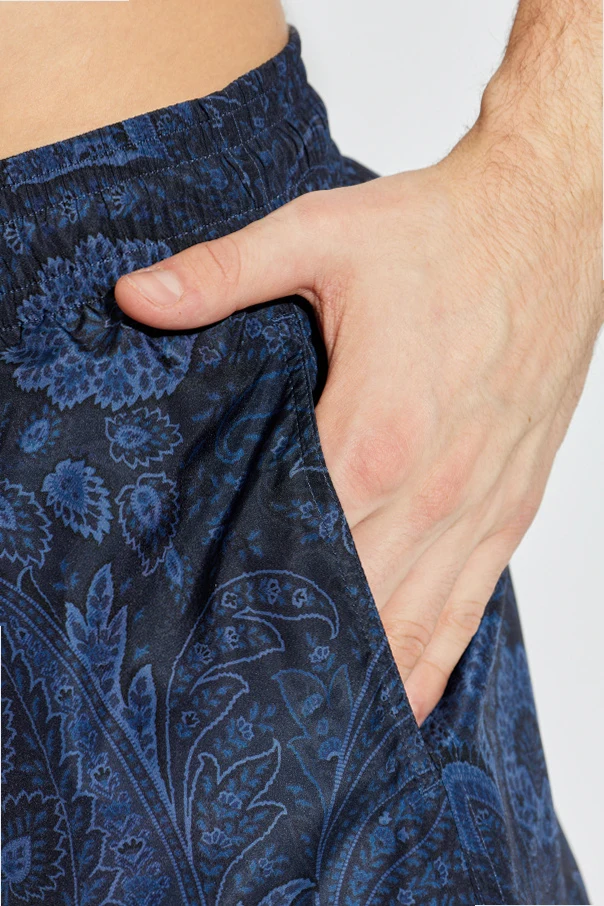Na całej powierzchni szortów dominuje niezwykle wyrafinowany, paisleyowy motyw w nasyconym, granatowym kolorze, będący hołdem dla indyjskiej tradycji i wizytówką domu mody Etro. Detale takie jak elastyczny pas ze sznurkiem utrzymanym w jednolitym odcieniu oraz funkcjonalna kieszeń z tyłu, zapinana na rzep, podkreślają precyzję wykonania i praktyczność projektu.