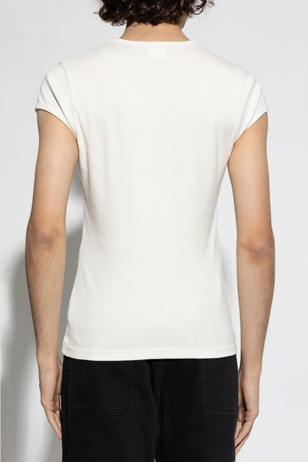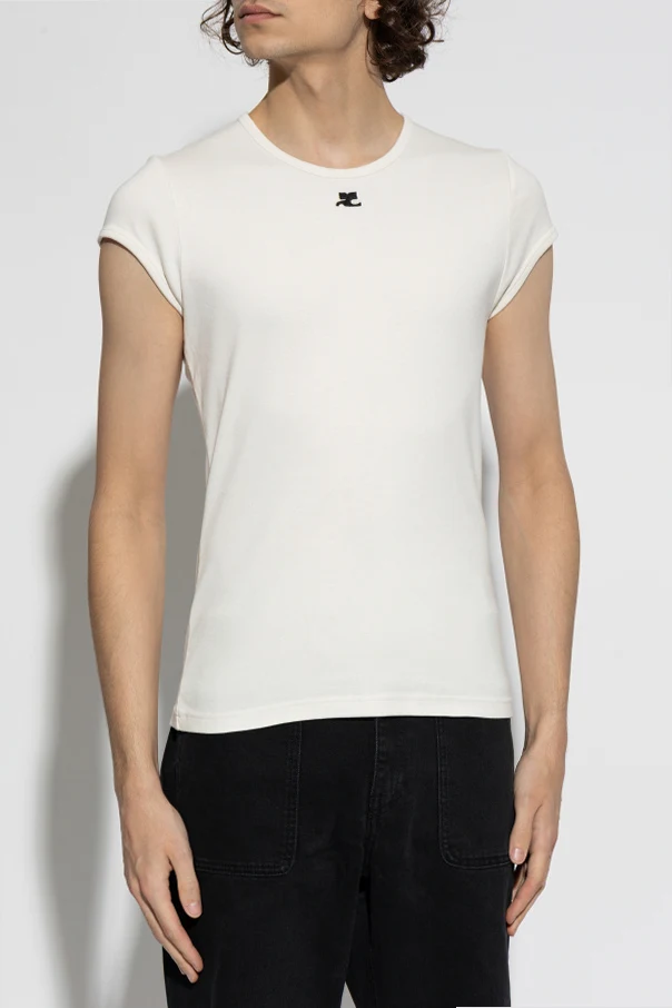 Kremowy T-shirt z wyszytym logo od prestiżowego domu mody Courrèges to synonim wyrafinowania i subtelnej nowoczesności. Klasyczny, dopasowany krój z zaokrąglonym dekoltem typu crew neck oraz krótkimi rękawami tworzy ponadczasową sylwetkę, która doskonale harmonizuje z minimalistycznym zamysłem projektu.
